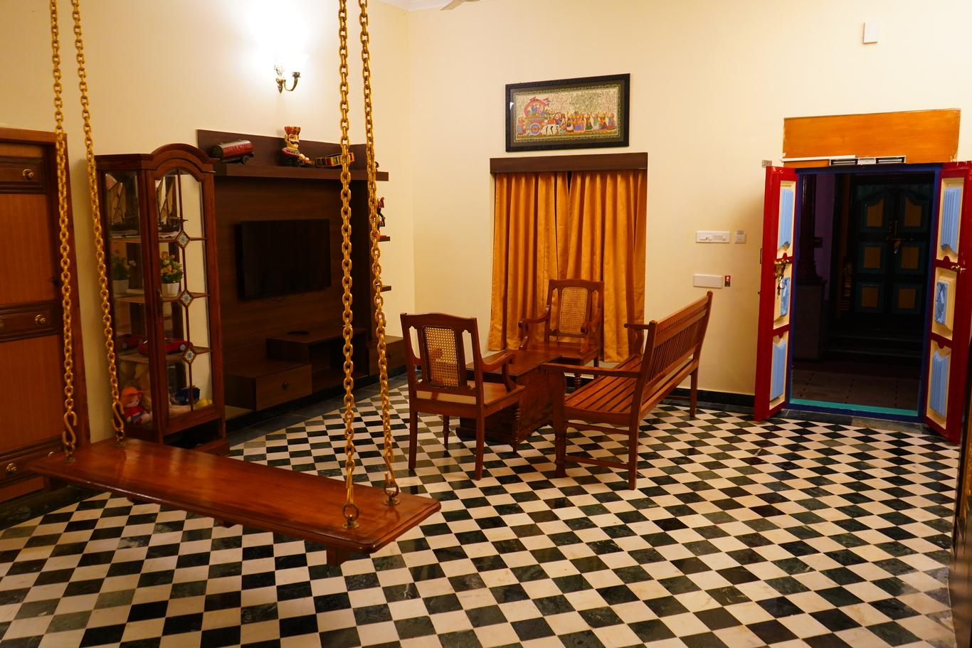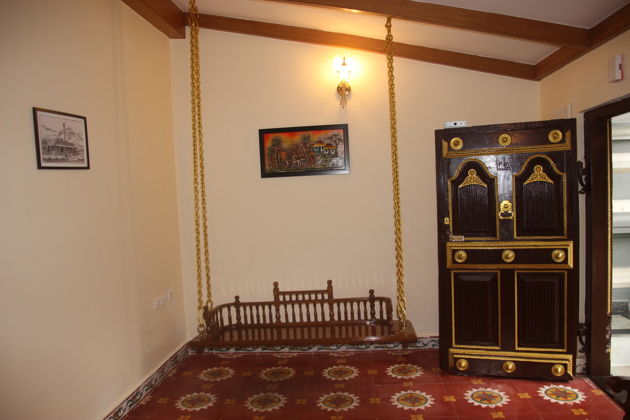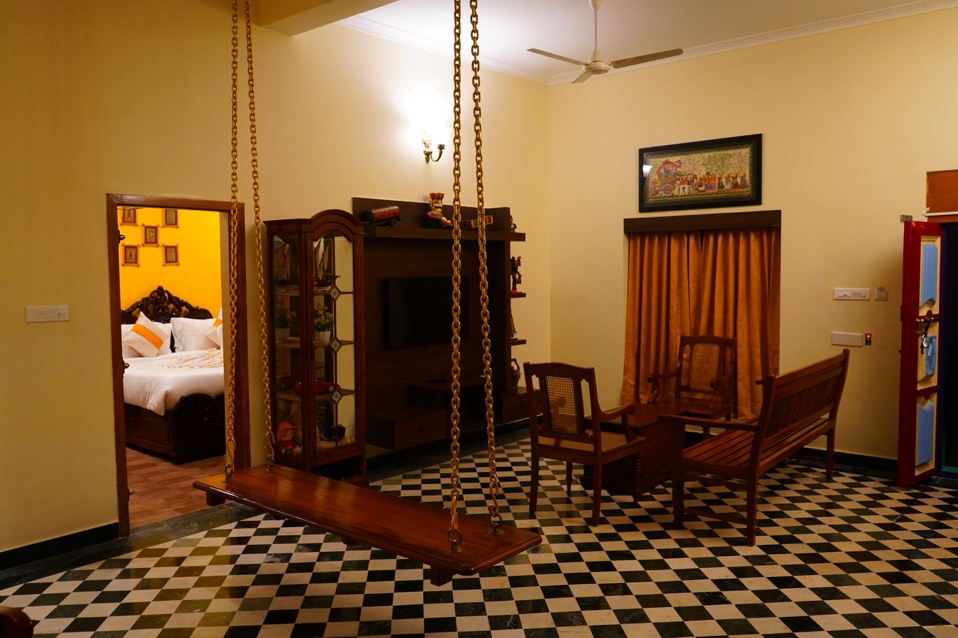 The “Temple Street Suite – Double Bed Room” is a masterpiece that pays homage to the rich cultural heritage of Aagraharam design. As you step inside, you’ll be greeted by the soothing ambiance of warm wooden accents, intricate carvings, and earthy hues, creating a serene retreat that transports you to a bygone era.